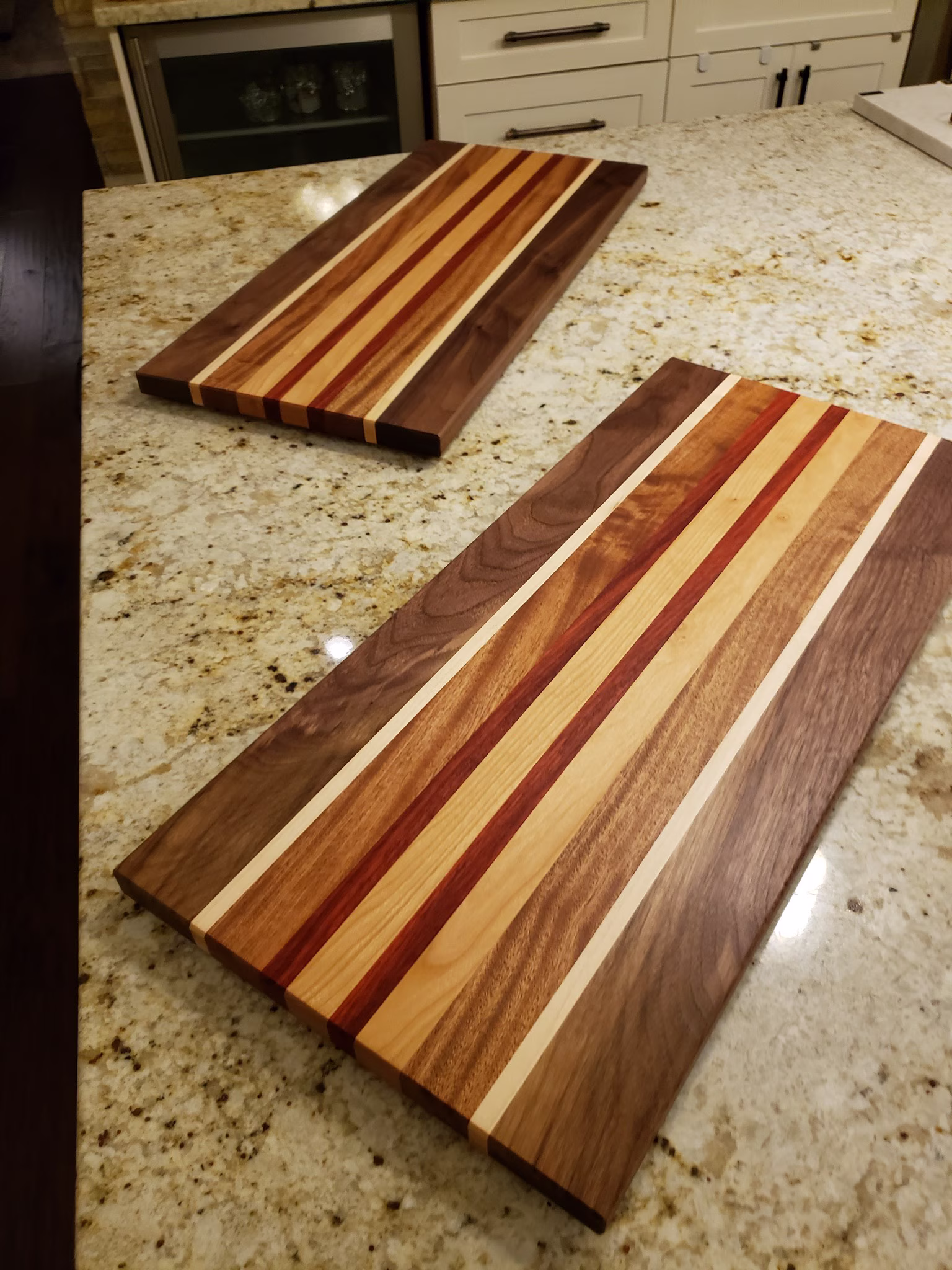 Serving trays made from walnut, maple, and a number exotic African woods