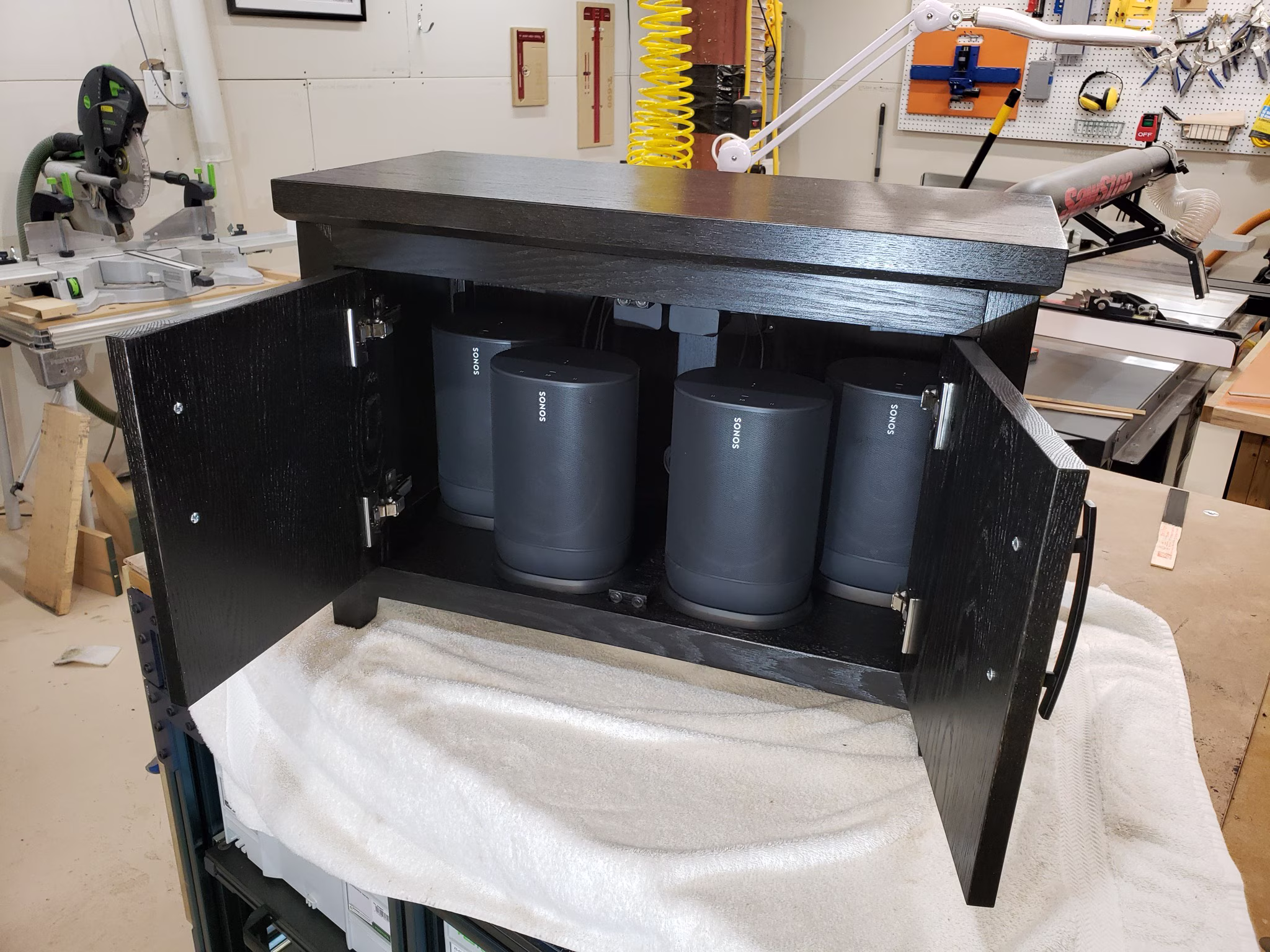 This was a custom commissioned piece by the customer (Debbie). She wanted an end table to fit just right by the sectional near the pool. I wanted a place to safely store my speakers from the elements. This piece did the trick.
