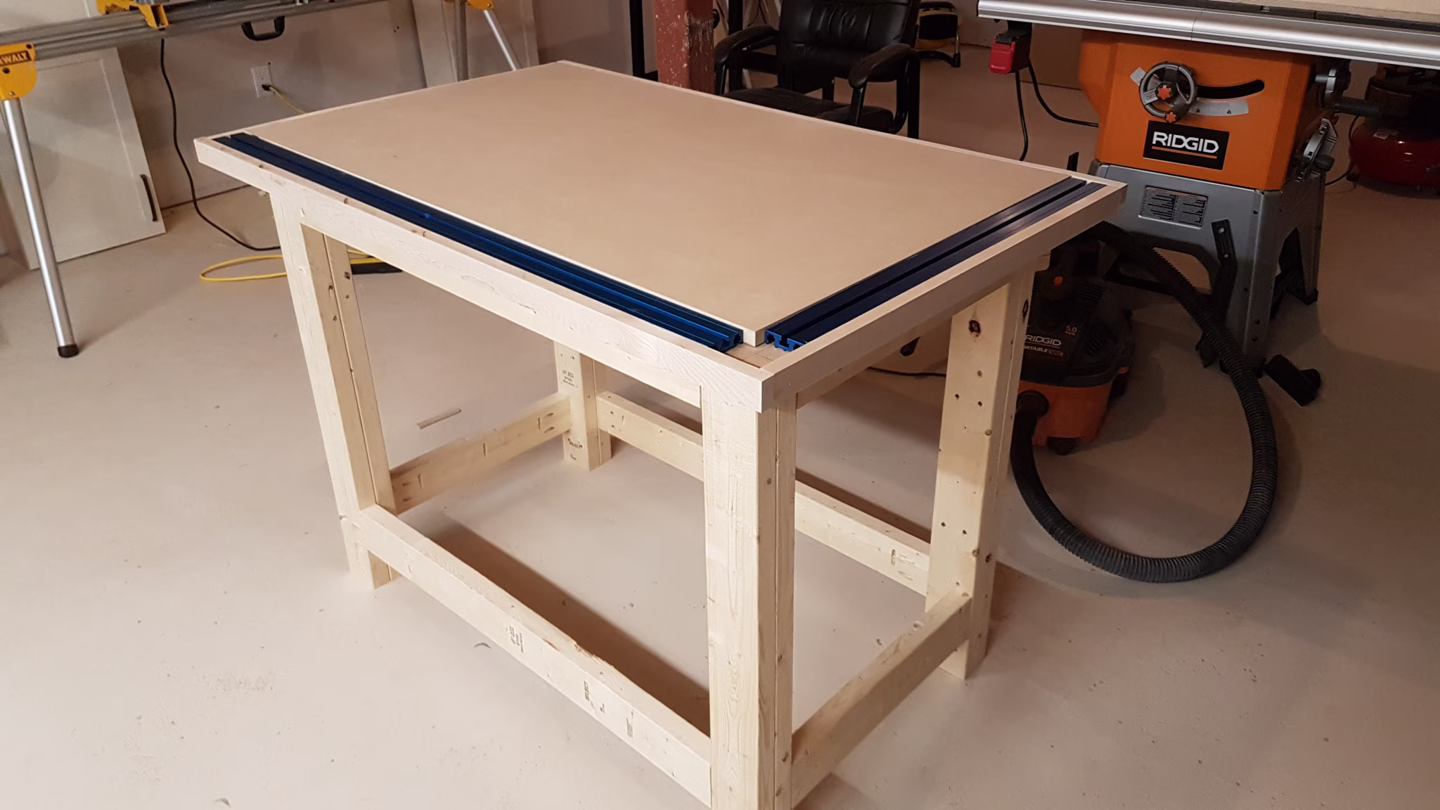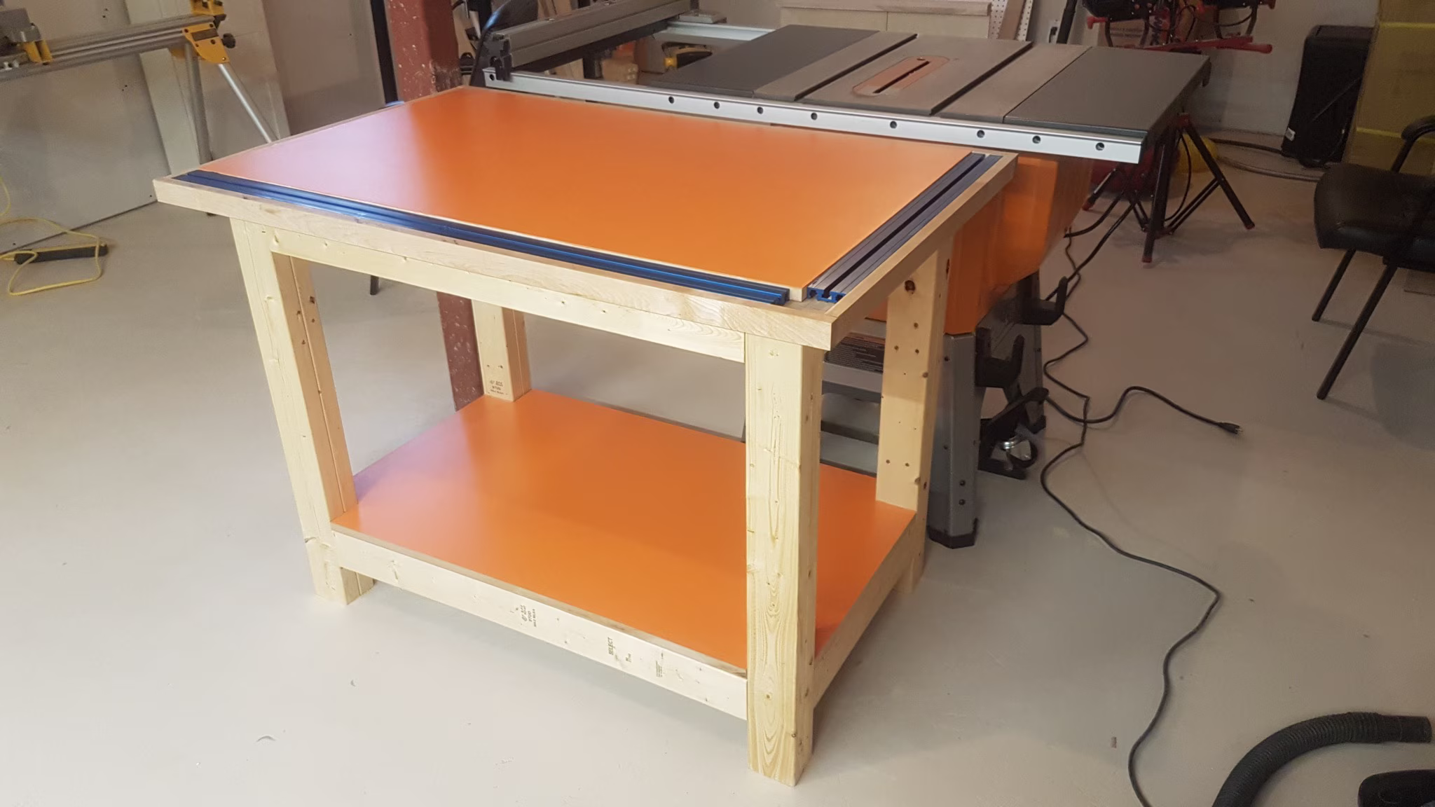 I put some Kreg track on the top, the blue aluminum extrusion shown here, which one can use to clamp things down. I finished it off with some enamel orange paint and coated the 2x4s in a couple of coats of Tung oil.