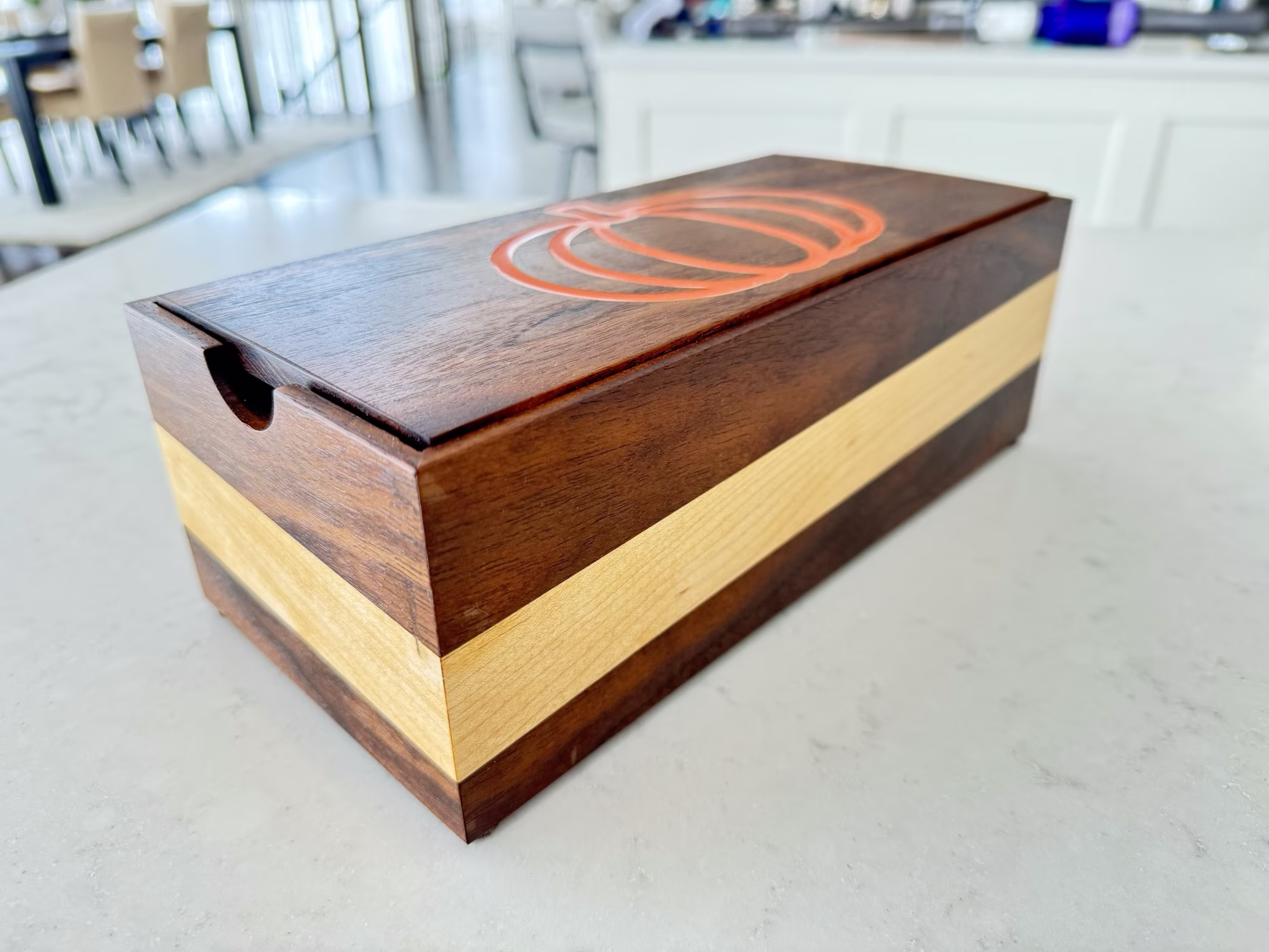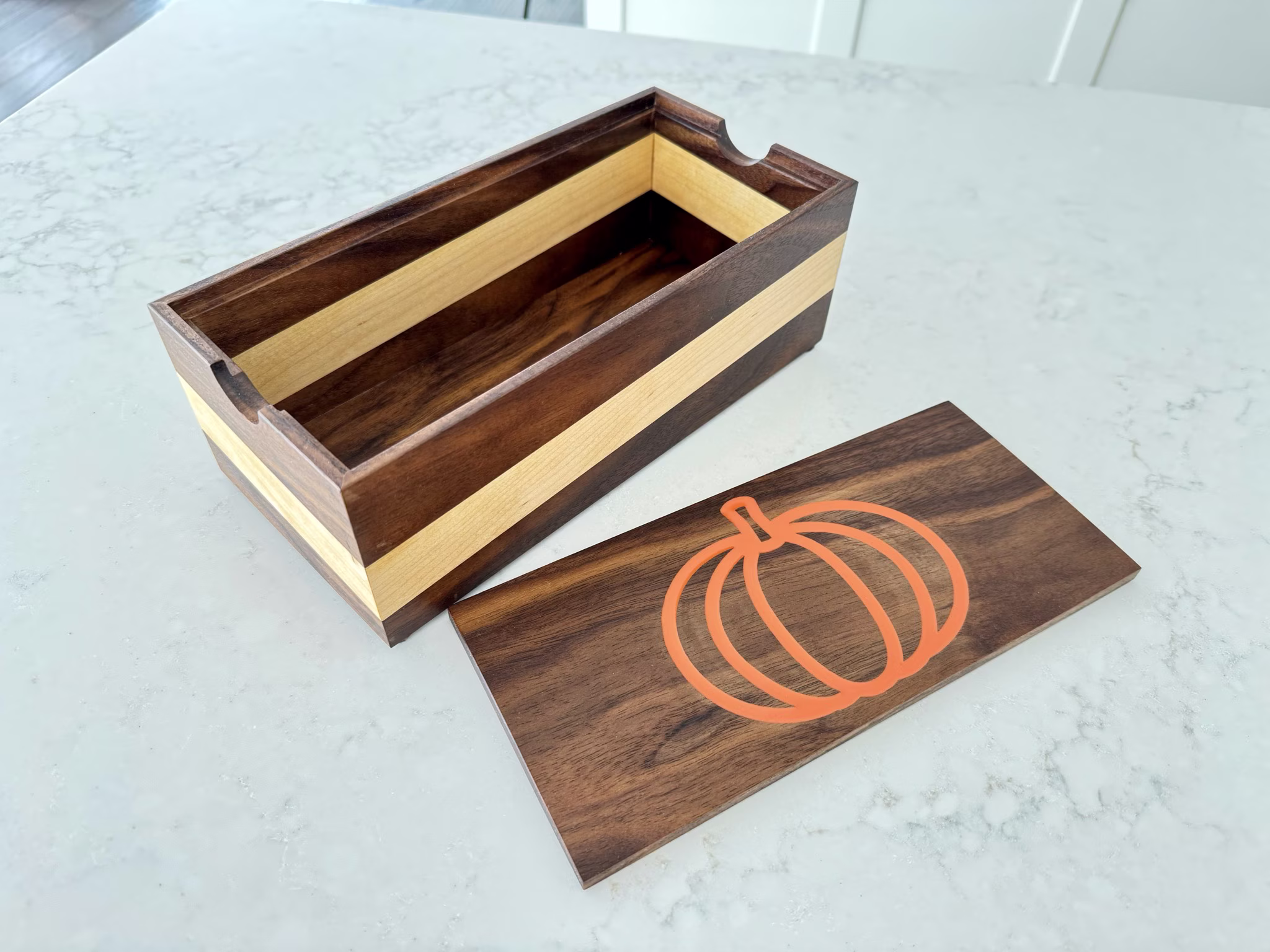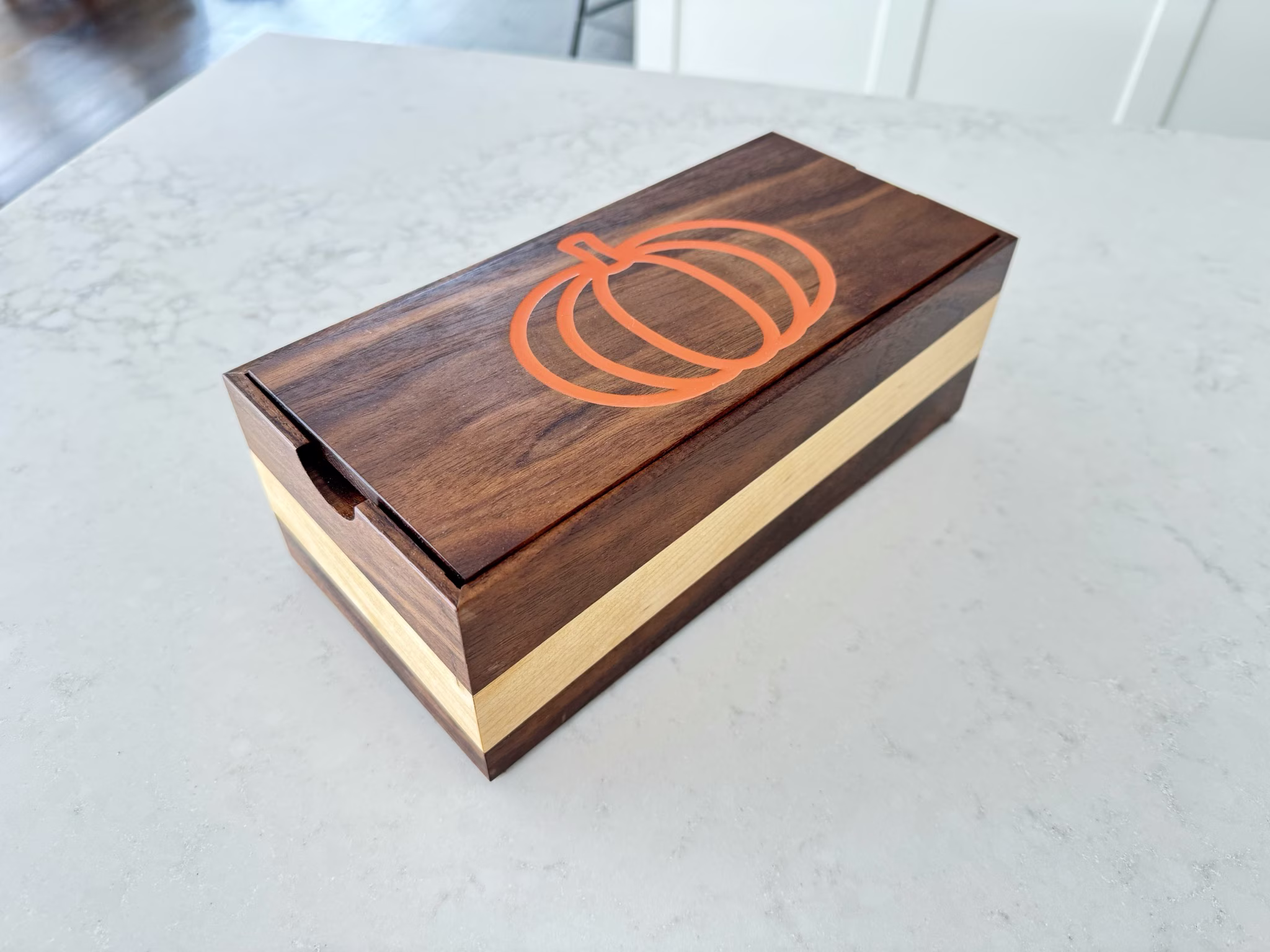 A walnut box with maple pin-striping, and a pumpkin logo on the top