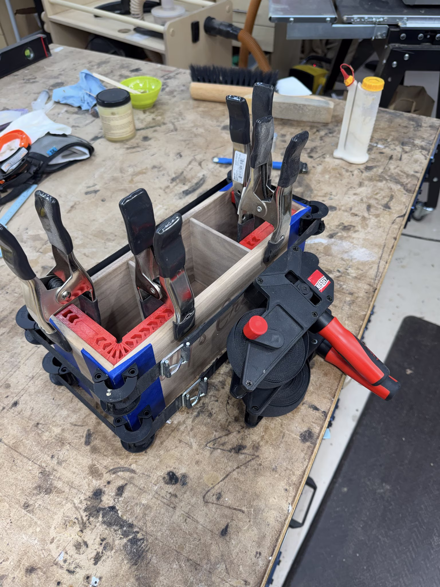 Band clamps are great for mitred boxes as the put the force on the corner joints inward towards the centre of the box.