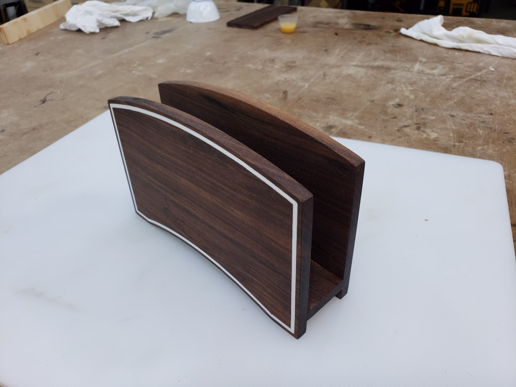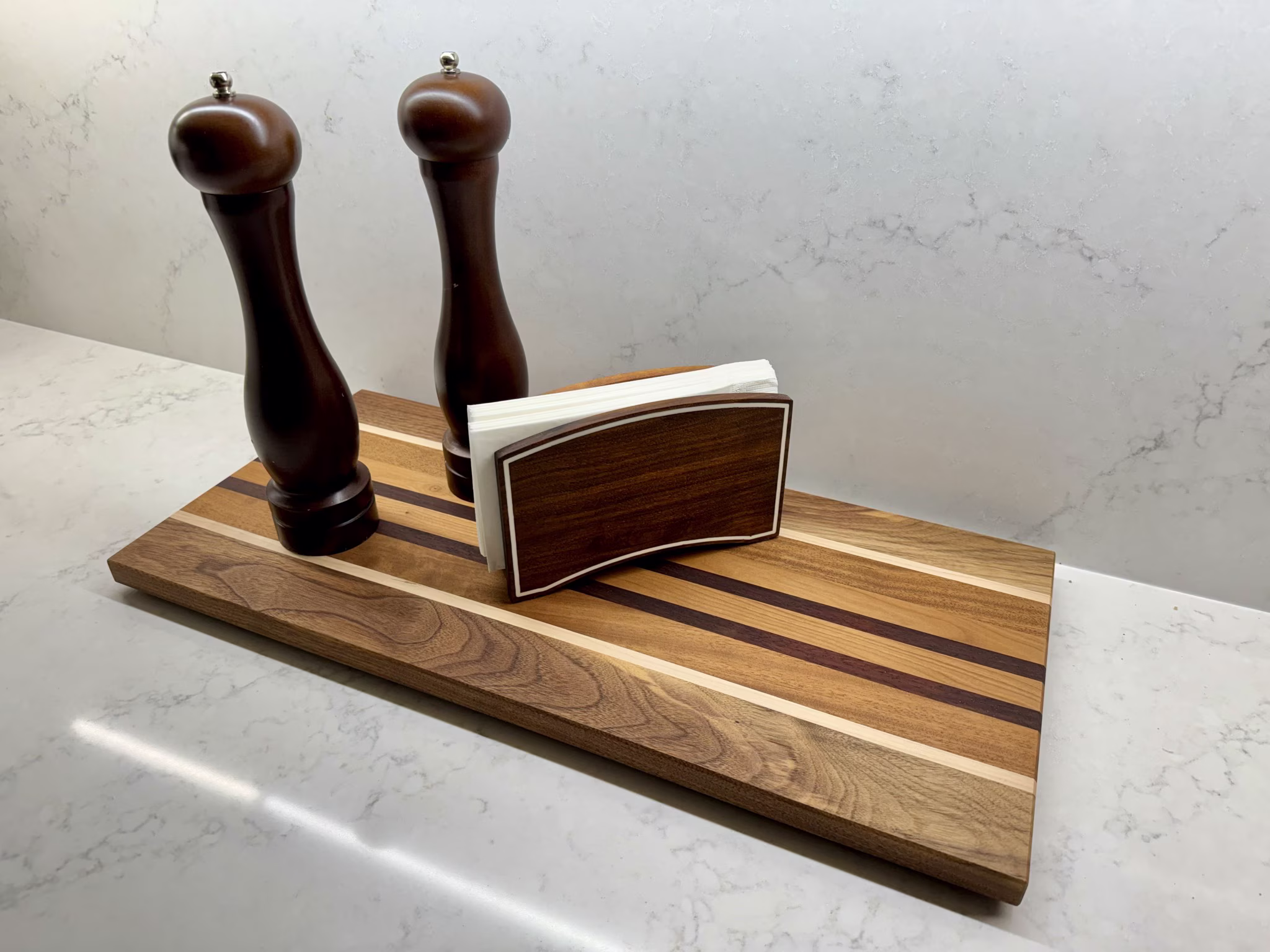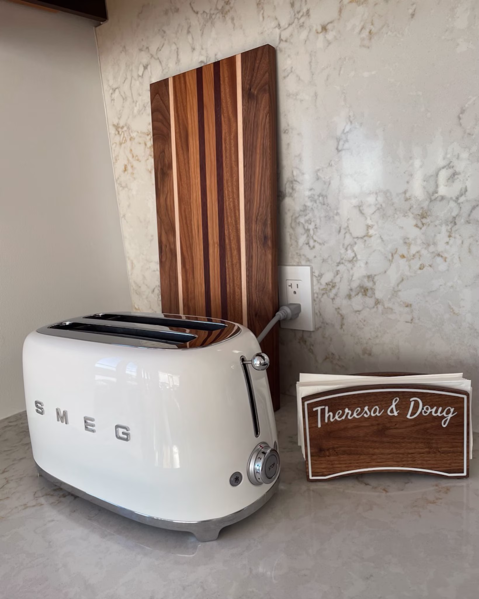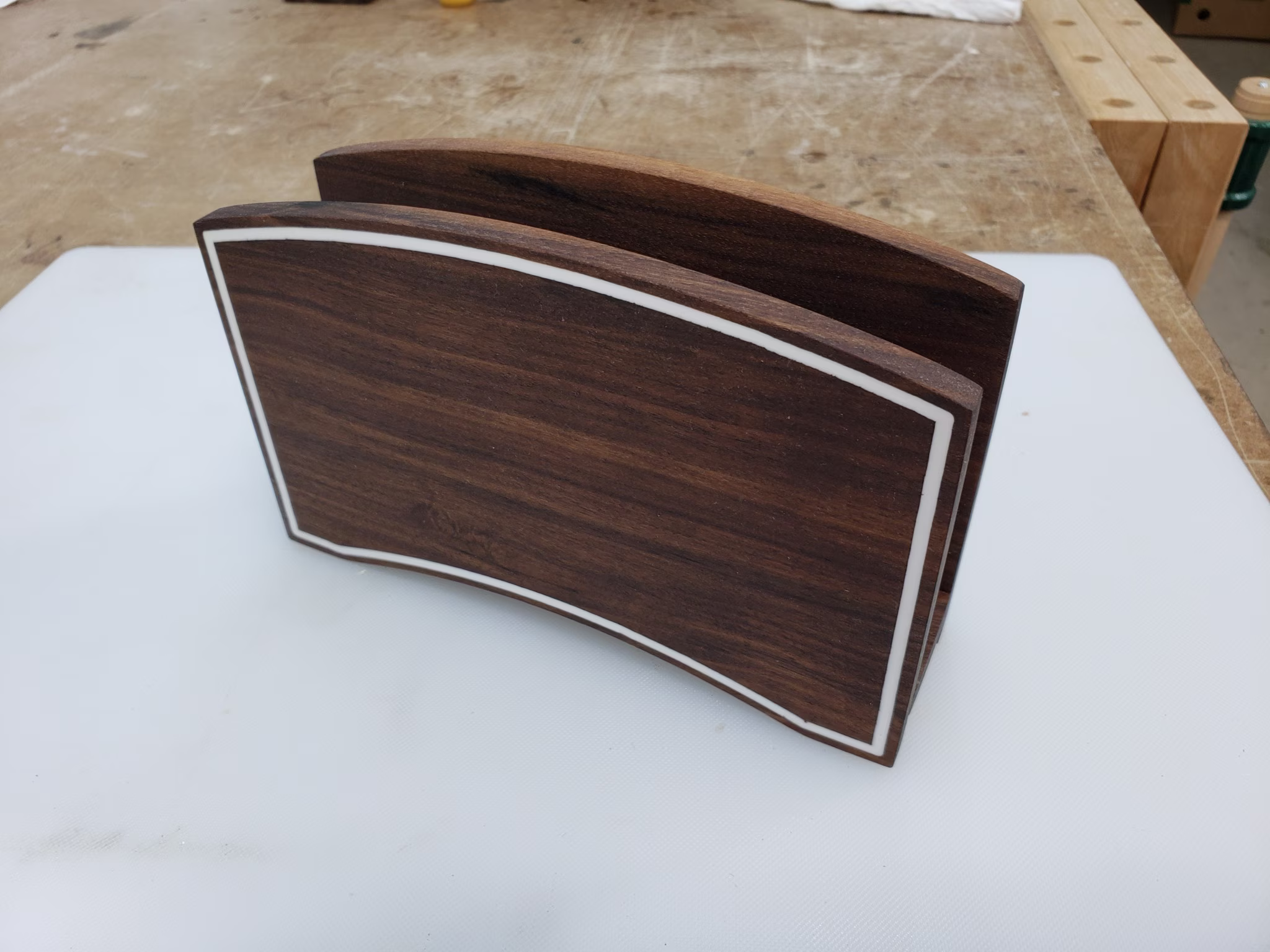 The napkin holder projects are among my favorites. Making these is a small challenge, it makes you work at it, but not too hard. I made one for our kitchen, then another for our friends Theresa and Doug. Hence the Theresa and Doug engraving. It would be silly to put Patty and Dave on it, and then give it to Theresa and Doug.