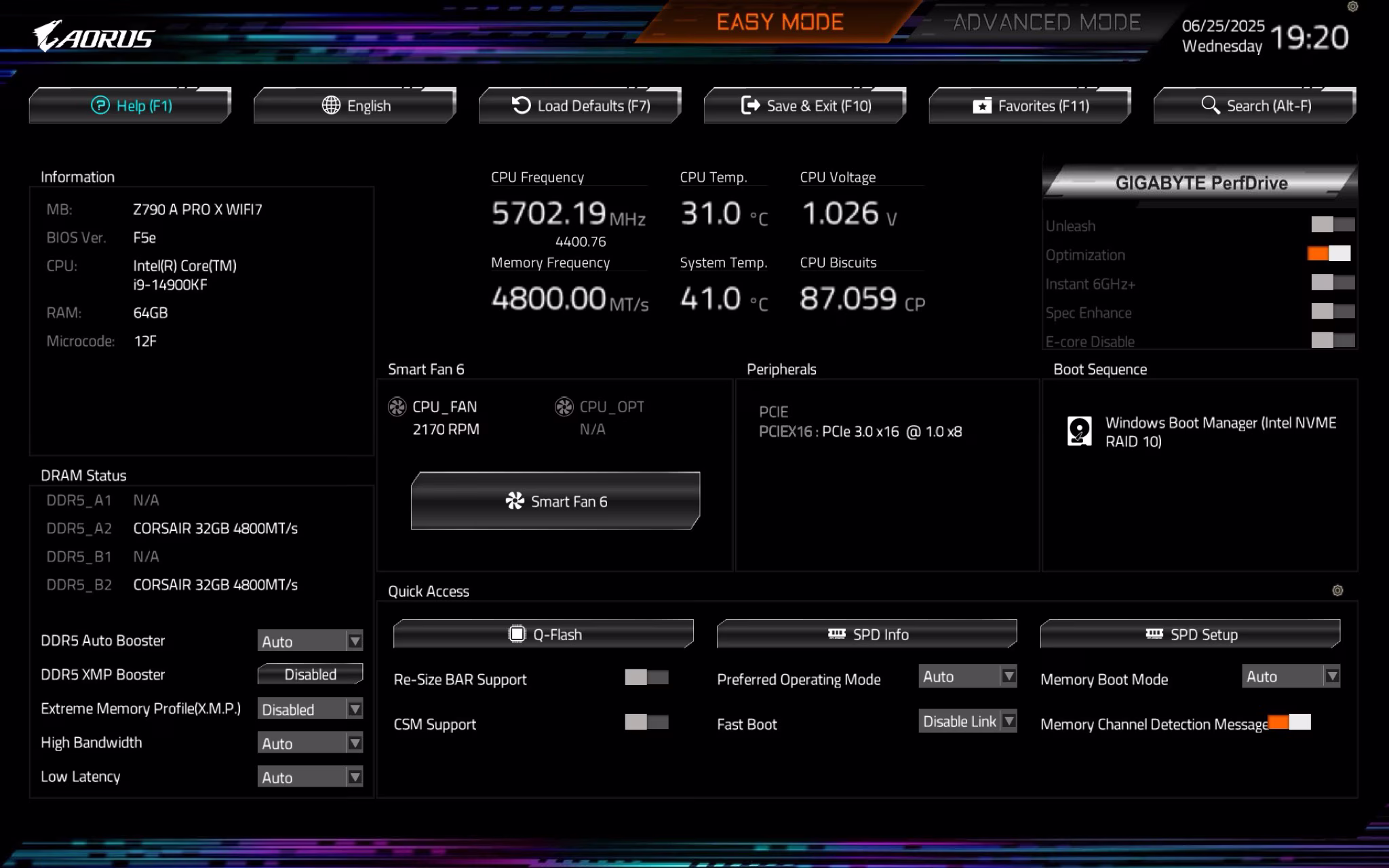 This was a bit of a departure for me. The Gigabyte brand of motherboards is targeted a bit more towards gamers, which means it has a lot of overclocking features and stuff for flashy RGB light do razzle-dazzle on all your components. I don’t need or even want those things as they can destabilize things, and my PC is hidden behind the desk anyway.