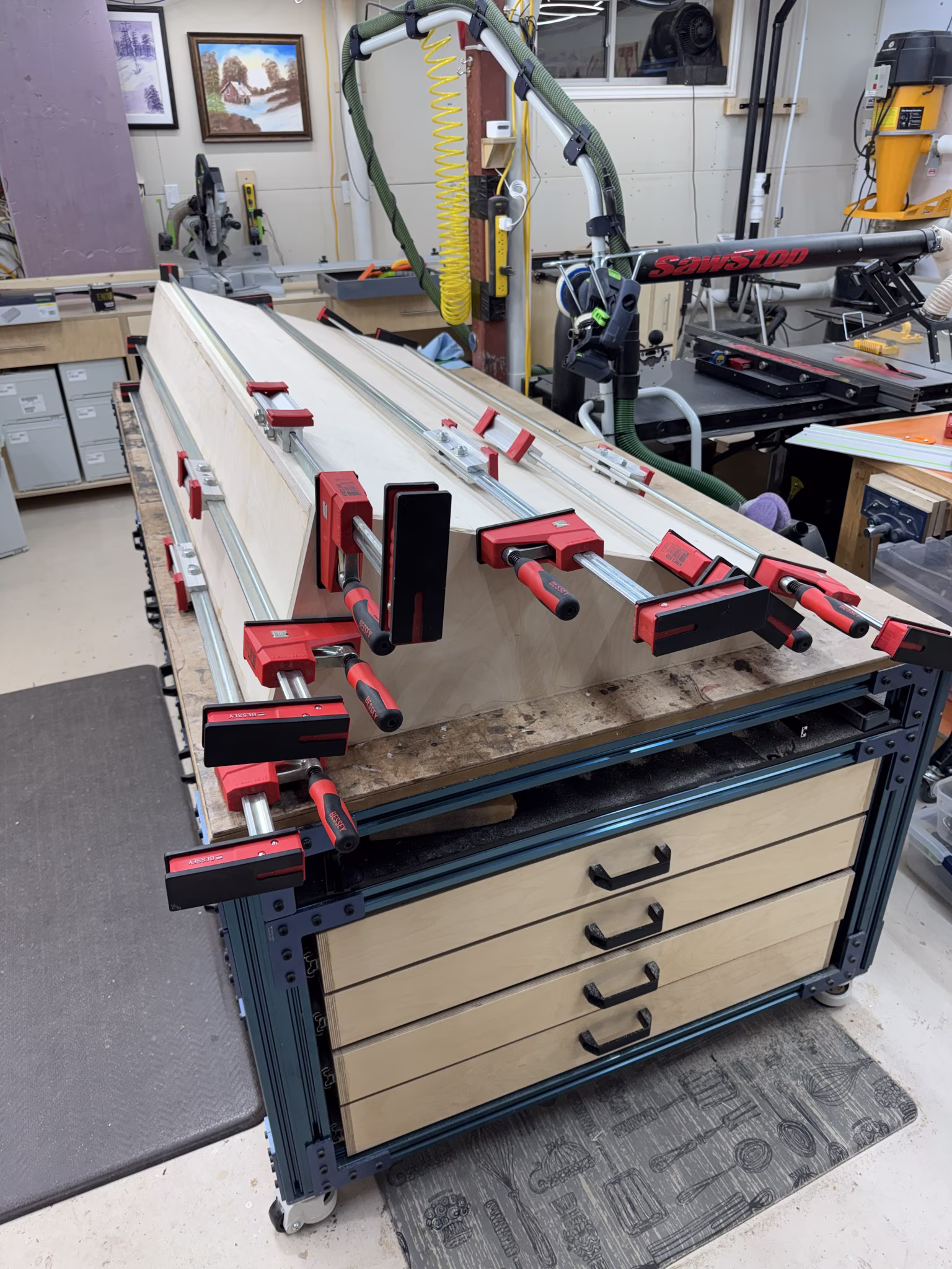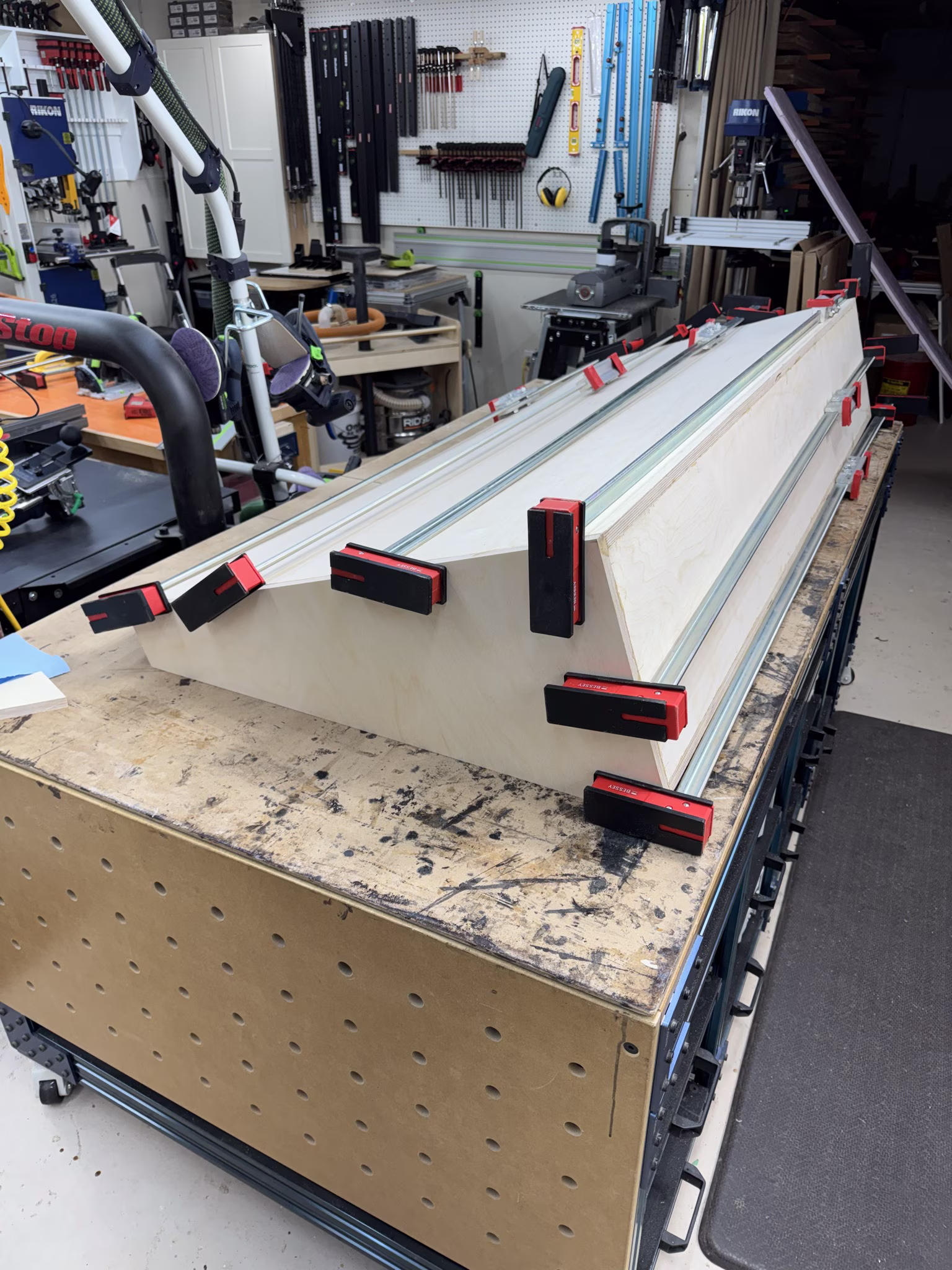 Second was the fact that this shelf is almost 2 meters long (6ft 6in). I do not have any clamps that long so I had to use a nifty extender thing that will join two shorter clamps together to make one long one. They are a bit of a pain to setup, but super handy to have in this kind of situation.