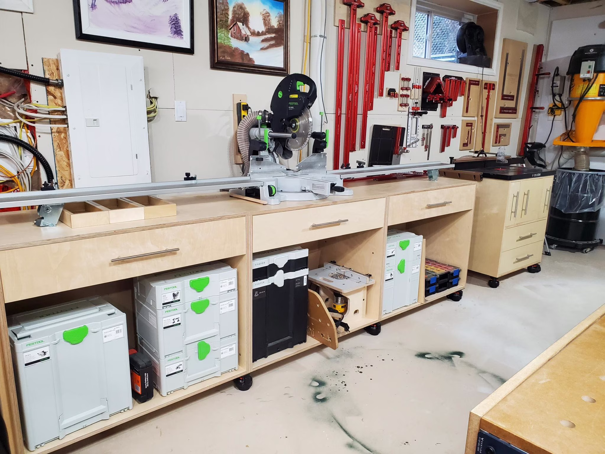It is so nice to have a proper set of workshop stands for the router and the mitre saw along this wall. I would show you a “before” drawing so that you could see the difference, but that would be embarrassing.